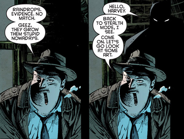 The issue also includes an appearance by Commissioner Gordon and a nice on-the-job conversation between Harvey Bullock and Batman. Not only am I glad to see Bullock has survived the reboot, I rather like seeing that he’s the one who notices Batman has gone back to his old method of hiding in the shadows.