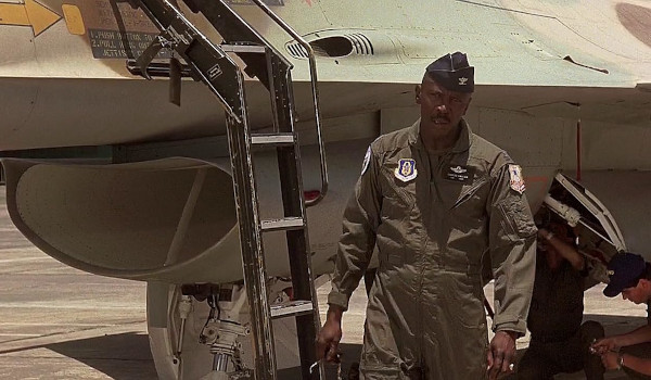 After his father (Tim Thomerson) is shot down and put on trial in the Middle East, Doug begins using his access on the base to gather intel and plan a rescue. He enlists the help of Colonel Chappy Sinclair (Gossett) who eventually agrees to help plan and, along with Doug, fly stolen F-16s overseas to rescue his father before he is put to death. Unbelievable? Sure, but less so than Tom Cruise shooting down modern jets while flying a broken down plane missing the majority of its outdated electronics? Not really.