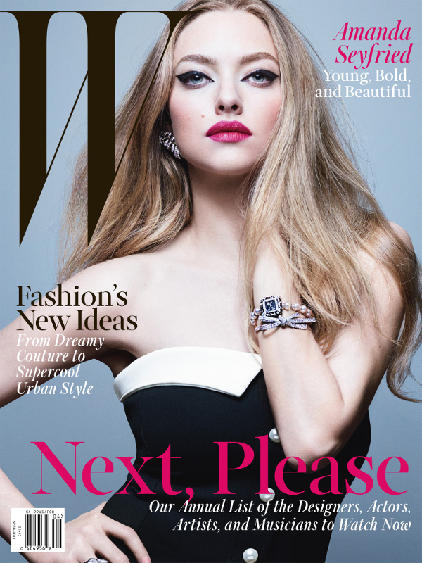 Helping to promote her role in Seth MacFarlane‘s new summer comedy A Million Ways to Die in the West, actress Amanda Seyfried is the cover girl for the April issue of W Magazine. In the interview the actress discusses making out with Megan Fox in Jennifer’s Body, her first boyfriend, working with Noah Baumbach on While We’re Young, her love of a really good sex scene, adopting her dog Finn from Big Love, and how Les Misérables made her a star. You can find the pics from her photo shoot inside.