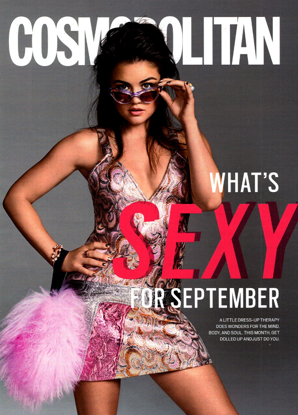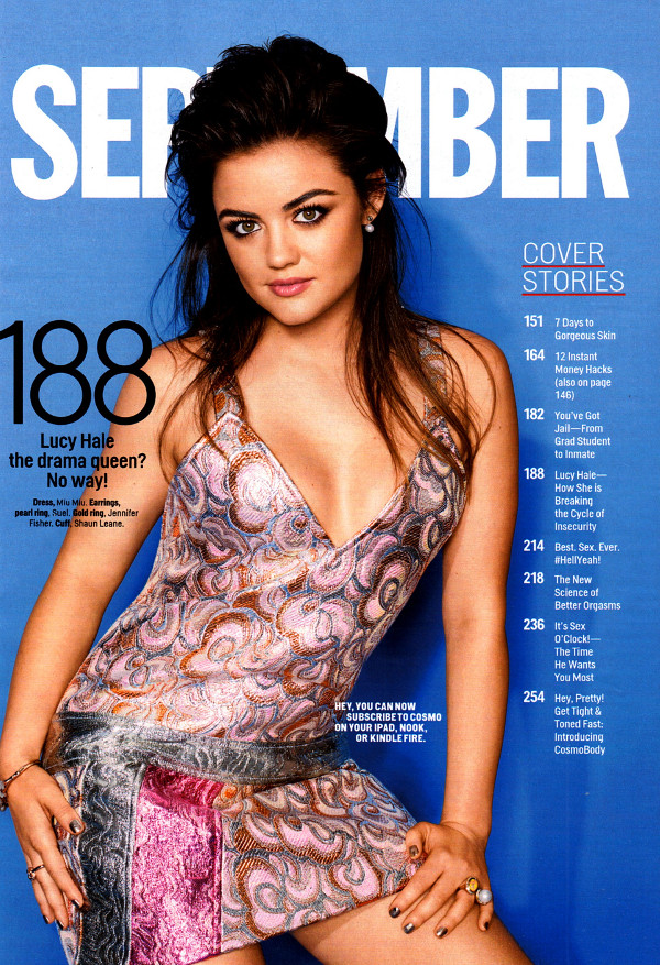Pretty Little Liars star Lucy Hale is the cover girl for the September issue of Cosmopolitan in which she discusses her Fifty Shades of Grey audition, making her debut country album Road Between, and the image of young actresses Hollywood sells . You can find the pics from her cover shoot inside.