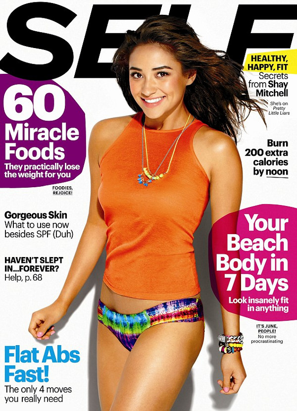 In her interview for the latest issue of Self Magazine Pretty Little Liars star Shay Mitchell discusses her love for a $3 bottle of wine, dispensing romantic advice on Twitter, Tumblr, and Instagram, staying calm, running on the beach, her workout routine, starving herself during her modeling career, pink boxing gloves, working as a waitress in Toronto, her friendships with her fellow Liars, and her desire to be a Bond girl. You can find pics and a behind-the-scenes video from the article inside.