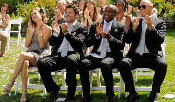 When the accountant escapes before Lassie can make the exchange, and Marlowe makes her own escape from the gangster, the prisoner exchange doesn’t quite go as planned. With a little help from Shawn’s visions, the wedding party is able to find the bride, as well as the missing accountant, in time for the wedding. Despite an absent minister, and a gun fight by the mobsters who crash the festivities, nothing can stop Carlton and Marlowe from exchanging their vows.