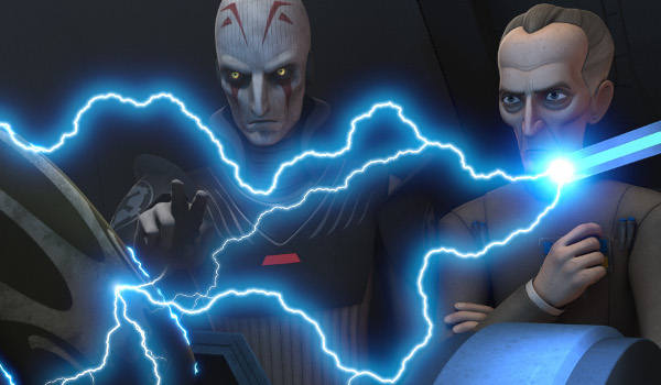 Despite Hera‘s (Vanessa Marshall) orders to lay low, Ezra (Taylor Gray) easily talks Sabine (Tiya Sircar), Chopper, and Zeb (Steven Blum) into rescuing Kanan (Freddie Prinze Jr.) who is being held, and tortured, by Grand Moff Tarkin (Stephen Stanton) and the Inquisitor (Jason Isaacs). Not knowing where to start, Ezra is forced to reveal his secret to Vizago (Keith Szarabajka) and agree to I.O.U. likely to bite the young padawan in the ass in the near future (if he lives long enough).