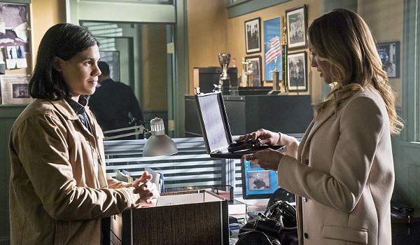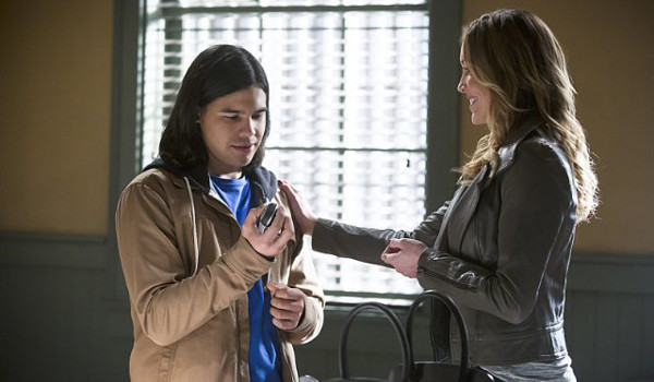 Not only does “Who Is Harrison Wells?” begin to answer the question about Barry’s mysterious benefactor and provide several fun fan-service moments including Cisco meeting Laurel (Katie Cassidy) and Caitlin and Barry smooching, but the episode also pushes forward stroylines on both shows while the Flash struggles to deal with an entirely new type of enemy. The pairing of Joe and Captain Lance (Paul Blackthorne) (two career cops with headstrong daughters) helps the former find answers about an evil scientist while foreshadowing the end of the rift between Lance and his daughter on Arrow. Eddie’s frame-up requires more people within the department learn that not only the Flash but other metahumans are real. And Cicso’s meeting the Black Canary not only allows for a fun geek-out moment by the scientist but also puts him to use to update Sara’s sonic weapon to something one-step closer to the natural ability the comic character uses.