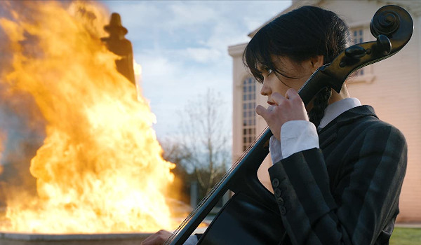 While the reveal of the secret society turns out to be disappointing, the episode does include several fun moments including Wednesday’s prank of burning the Pilgrim statue (celebrating a man who burned innocent people alive) in the town square while gleefully playing her cello in celebration. Elsewhere, Enid (Emma Myers) spends time with Ajax (Georgie Farmer) getting a little closer while working in the creepy antique shop, although a mistake will lead to a crimp in their romantic plans, Xavier (Percy Hynes White) reconsiders Wednesday’s opinions about Rowan‘s death, and our sheriff stumbles up on a crime scene and captured photos of the local monster.